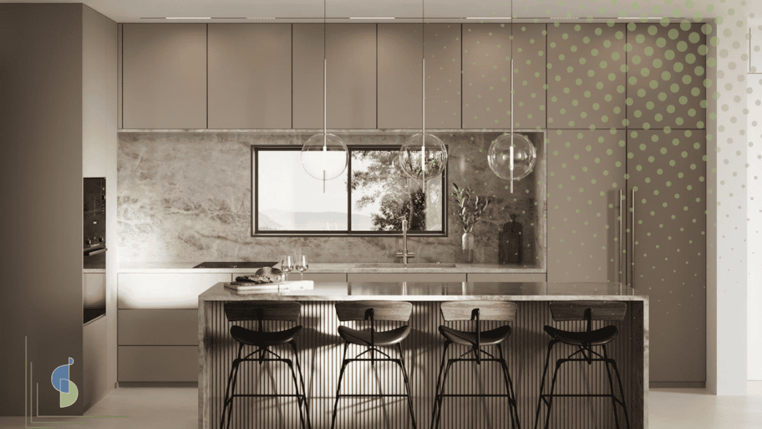 Este color funciona especialmente bien con iluminación cálida e indirecta. Las tiras LED bajo los muebles altos, las lámparas colgantes sobre el mesón o la luz puntual en la zona de trabajo resaltan el color sin alterarlo. El greige mantiene su tono estable en distintas condiciones de luz, lo que lo hace confiable al momento de diseñar.