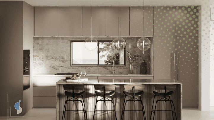 Sustituye solo los frentes de los gabinetes altos por paneles en greige ultra mate. Mantén los módulos bajos en madera clara o un blanco cálido. El contraste suaviza el ambiente y evita que todo se vea monocromático. - Resaltar la isla central