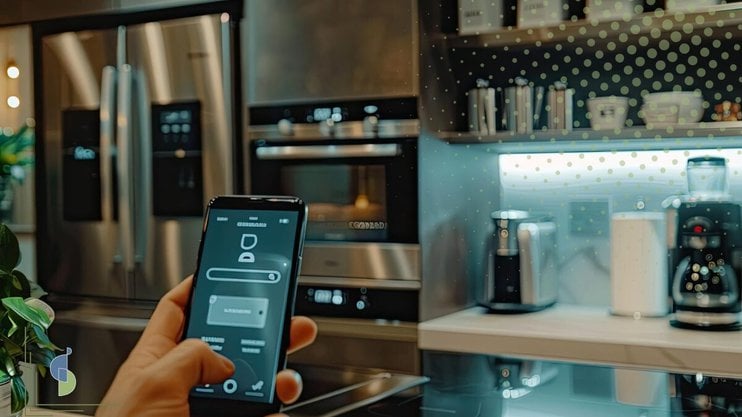Sensores de movimiento pueden apagar luces cuando nadie está en la cocina. Algunos refrigeradores pesan los alimentos y actualizan el inventario, permitiendo que el asistente de voz sugiera recetas o haga un listado de compras.